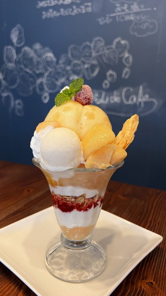 自家製桃アイスに白ワイン風味の桃ソルベと桃尽くし😊